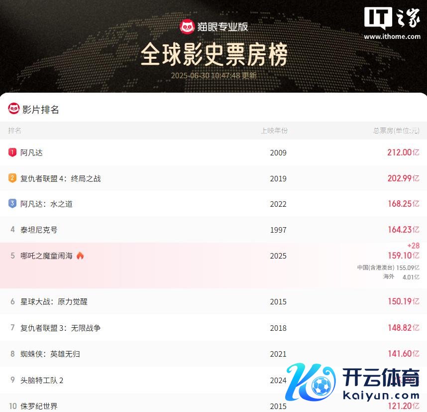 IT之家 6 月 30 日讯息,国产动画电影《哪吒之魔童闹海》密钥 6 月 30 日 23:59 追究到期。 据了解,哪吒 2 密钥延期四次,上映时长 153 天,现在位列天下票房第五位。 界限IT之家发稿,电影《哪吒之魔童闹海》天下累计票房达159.1 亿元(包含国际票房 4.01 亿元),位居天下影史第五,创造国产电影的多项历史。