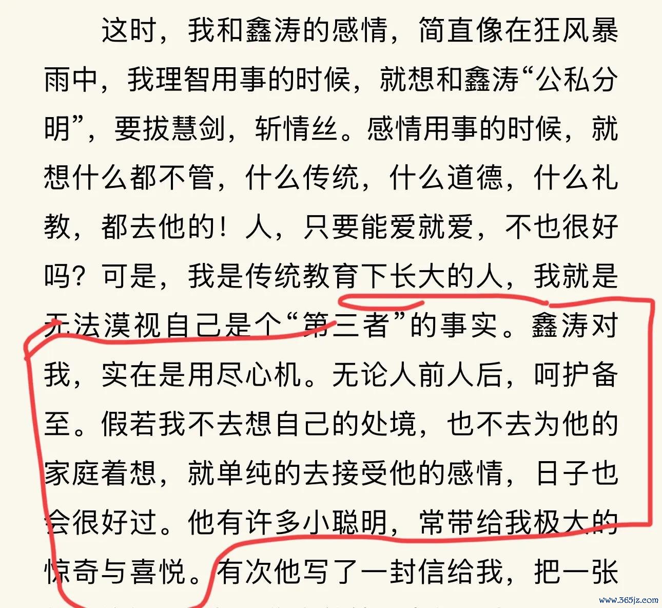 “鑫涛对我,着实是用精神思。不管东说念主前东说念主后,呵护备至。假若我不去想我方的处境,也不去为他的家庭着想,就单纯的去给与他的情谊,日子也会很好过。他有很多小灵敏,常带给我极大的惊喜与欢跃。”
