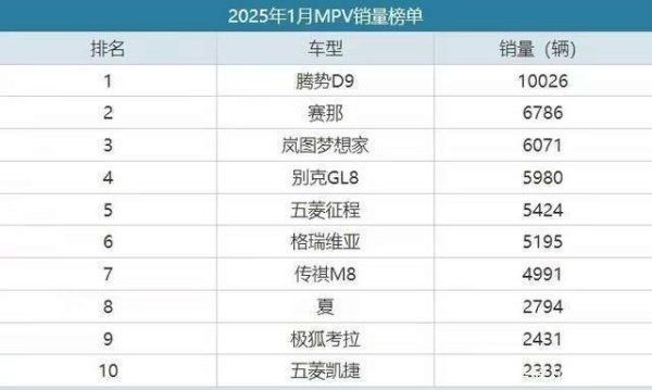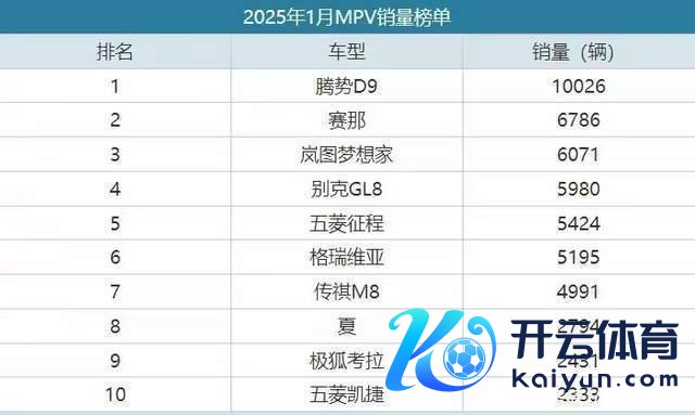 近期1月的MPV销量榜单追究出炉九游体育app娱乐,从榜单发达来看,阛阓呈现出多元化的竞争方法,从具体销量数据袒露,1月MPV总销量为87909辆,同比着落12.56%,而新能源车型渗入率显赫提高。接下来咱们就来看前十名车型的发达。 NO.1 腾势D9 销量:10026辆 腾势D9以10026辆的收成重夺冠军宝座,市占率达11.4%。凭借DM-i超混系统与豪华设立的都集,精确把捏了商务招待与家庭出行需求。纯电180km的续航和1040km的空洞续航,谄媚云辇-C智能悬架系统,在能耗与同意性间找