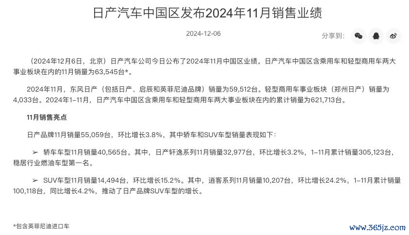 再来看日产汽车,11月份日产汽车中国区含乘用车和轻型商用车两大行状板块在内销量为63545辆,1-11月累计销量为621713辆。其中东风日产的11月销量(包括日产、启辰和英菲尼迪品牌)为59512辆。值得一提的是,轩逸系列依然是日产汽车中国区的销量担当,11月销量达到32977台,环比增长3.2%;逍客系列11月销量则为10207台,环比增长24.2%。