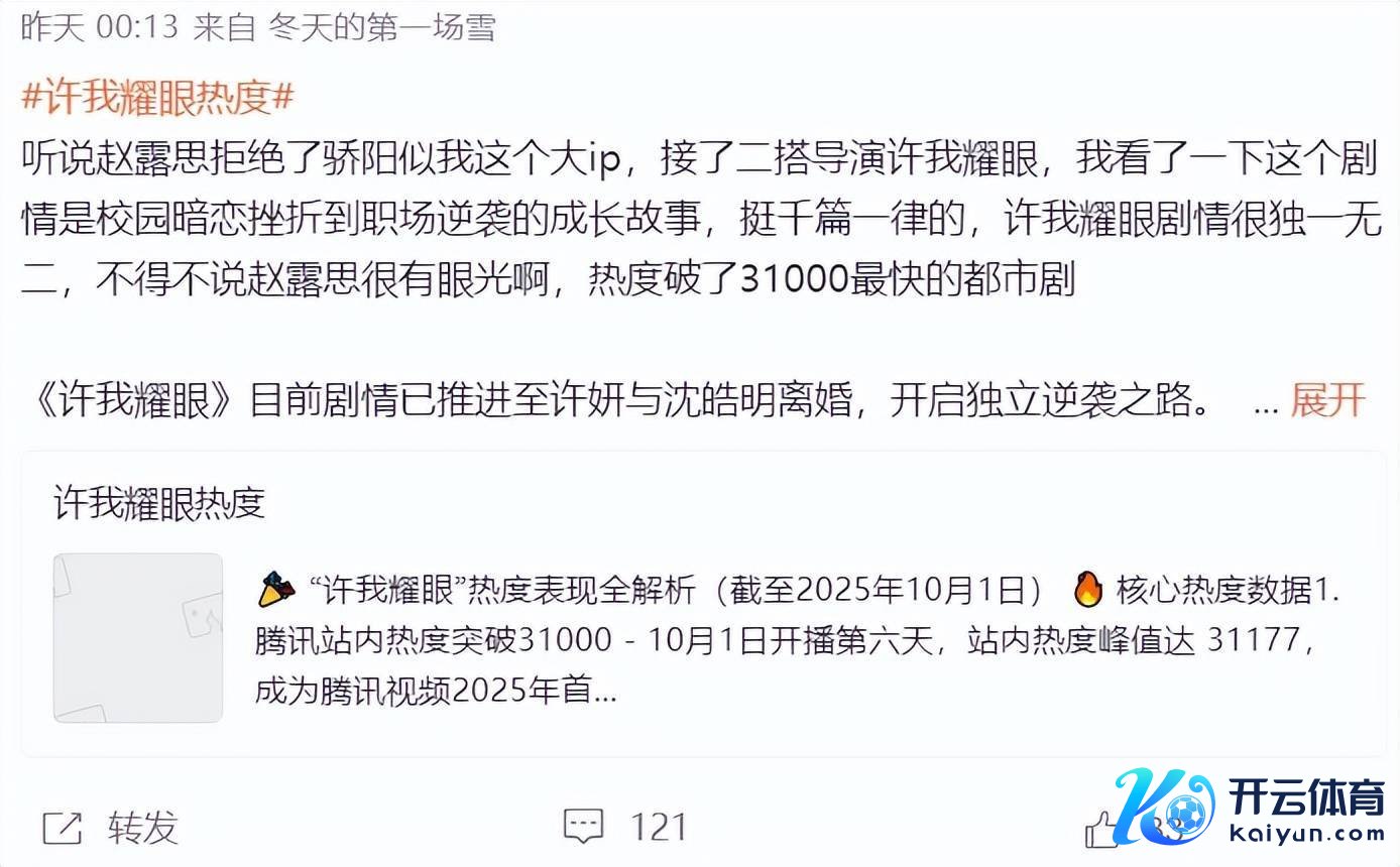 《许我留神》是“空降”播出的电视剧,根柢莫得任何宣传,属于径直开播,最关节的是,这部剧播出的时代偶合遭逢《赴山海》,固然这部剧是低调播出,但这部剧获得的成绩却相配高调,热度快速破30000,各项数据皆告捷登顶。