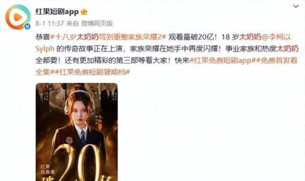前几日有博主发文问到,本年上半年有莫得什么确实出圈的爆款长剧? 驳倒区各说纷纭,十分吵杂,各大长剧片名恒河沙数,甘休仔细一看,众人王人有粉籍。 而出当前驳倒区的那些剧集,果然莫得一部能确实能走出粉丝数据带来的失实茂密。 没预想上半年曩昔许久,长剧市集依然如斯低迷九游体育app官网,冷的不像话。 长剧到底怎样了 和长剧的低迷相对应的,是短剧市集愈活气热的近况。 主作念短剧的视频平台红果前段时辰发了一则微博,是短剧《18岁太奶奶驾到,重整家眷荣耀2》的不雅看量破了20亿的战报,这个数据不可谓不惊东谈主。 毕竟少了大面积的粉丝衔尾,这个数据应该是确实的。 许多网友王人在疑问,不雅众王人怎样了,怎样王人一股脑跑去看短剧了? 真话说,短剧市集就算再红火,在收视东谈主群上依然不成和长剧同日而论,至少当前如故这么的。 短剧主作念下千里市集,但长剧的不雅众市集并不会单单局限于下千里东谈主群,只须长剧的质地过关,它的出圈效应远不是短剧能作念到的。 可问题就出在了这里,长剧照旧很久莫得质地极渡过关的作品了。