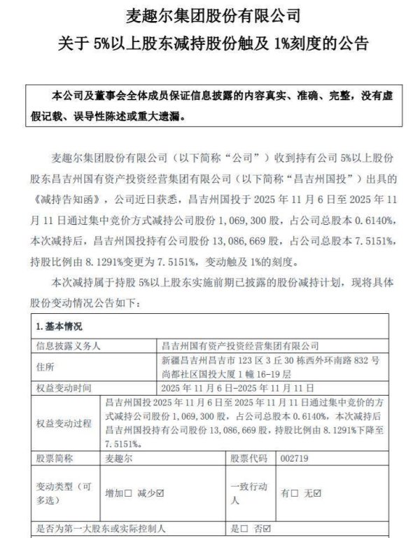 麦趣尔11月12日公告称,其国资鼓吹昌吉州国有金钱投资琢磨集团有限公司(下称昌吉州国投)近期减抓股份,触及1%刻度线,减抓后抓股比例降至7.5151%。