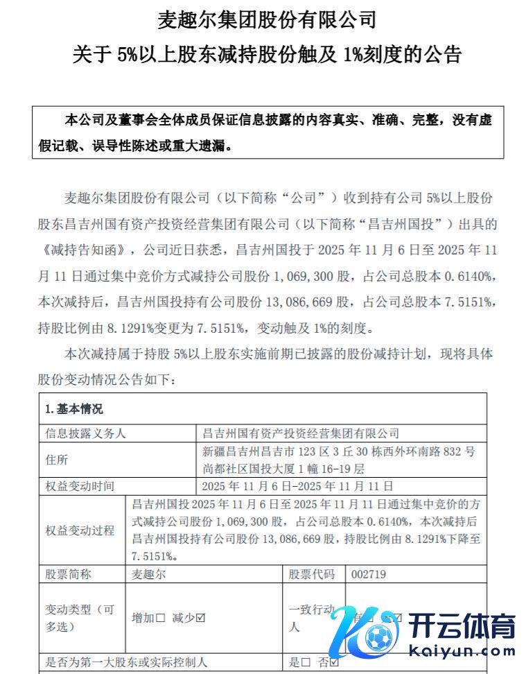 深圳商报·读创客户端记者 詹钰叶九游体育app娱乐 麦趣尔11月12日公告称,其国资鼓吹昌吉州国有金钱投资琢磨集团有限公司(下称昌吉州国投)近期减抓股份,触及1%刻度线,减抓后抓股比例降至7.5151%。 麦趣尔发布的公告败露,其抓股5%以上鼓吹昌吉州国投于2025年11月6日至2025年11月11日历间,通过深圳证券来去所蚁集竞价来去系统累计减抓麦趣尔股份106.93万股,占公司总股本的0.614%。本次减抓完成后,昌吉州国投仍抓有麦趣尔股份1308.6669万股,抓股比例由减抓前的8.12